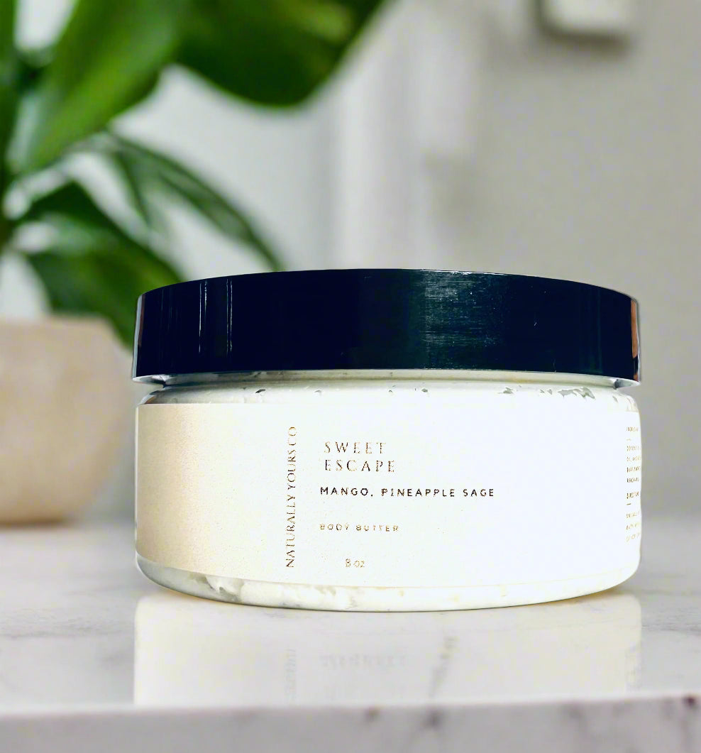 Indulge in a tropical getaway every time you moisturize with Sweet Escape Body Butter—a decadent blend of juicy mango and aromatic pineapple sage that leaves your skin feeling soft, radiant, and deeply nourished. This whipped, creamy formula melts into your skin, providing long-lasting hydration while surrounding you with the lush, sun-kissed scent of paradise.